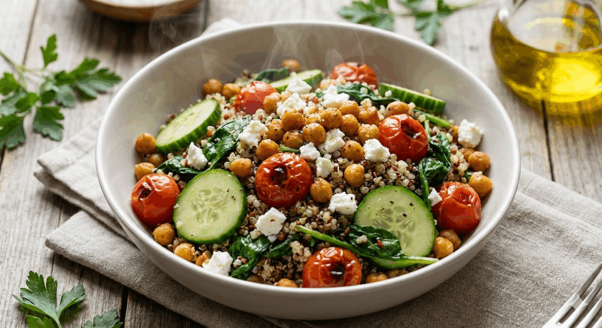 Descripción: Granos, legumbre y verduras en contraste tibio-frío; textura crujiente y cremosa. Origen/contexto: Inspirada en la cocina mediterránea con toque de Oriente Próximo. Ideal para: almuerzos ligeros o como acompañante. Dificultad: baja.