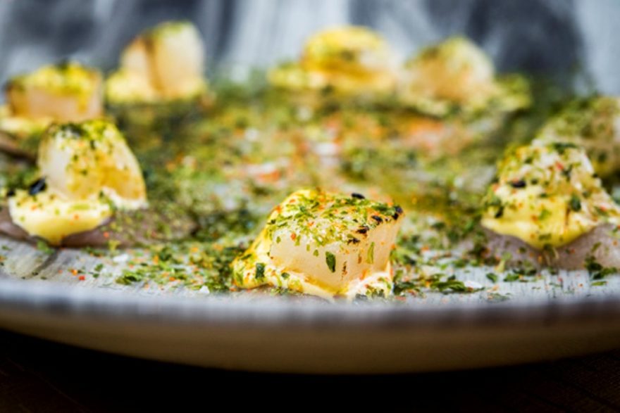 Tataki de atún con ponzu de jerez, mentaiko y chips de ajo