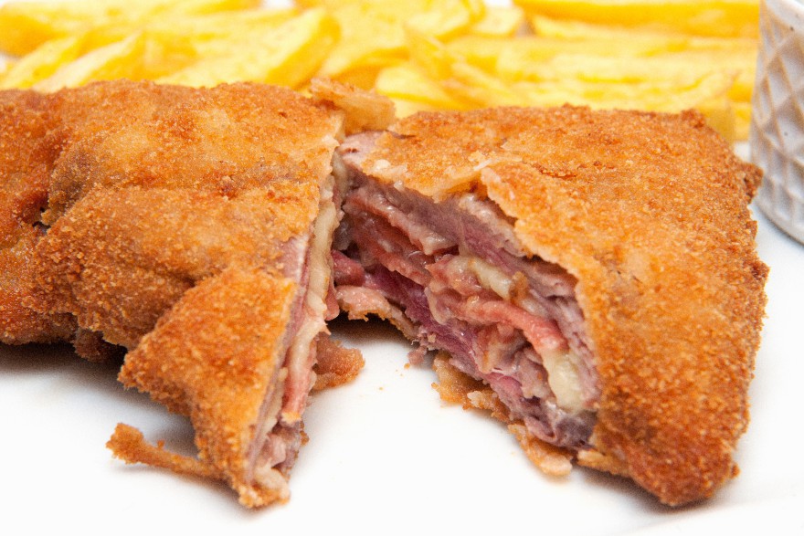 El cachopo de vaca joven asturiana se rellena de jamón ibérico y lonchas de Vidiago, que se derriten entre los filetes de solomillo. Criado 12 meses en barrica de roble francés, la estructura y persistencia del Legardeta (Finca de Villatuerta) Selección Especial 2013 ahonda en la carne roja, desafiando sin tapujos la fiereza y triple mordiente del cachopo. De profundo rubí, la fruta roja y el arándano, de matices ahumados, preceden a un navarro de único adjetivo: elegante.