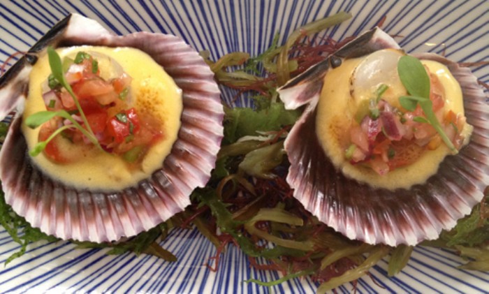 Zamburiñas con salsa holandesa de yucu y pico de gallo