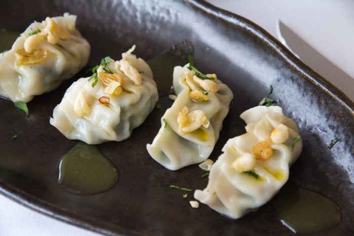 Giozas de gambas al ajillo con emulsión de yuzu y miso, miga de tempura y cilantro. Inspirada en Japón y España, una fusión de las clásicas giozas al vapor con uno de los toques más españoles, las gambas al ajillo, un plato en el que se ven representadas las dos culturas.