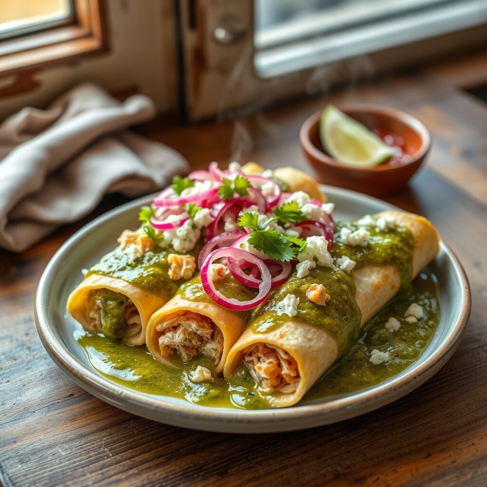 Estas enchiladas verdes de pollo funcionan tanto como plato cotidiano como en mesas compartidas: ofrecen contraste entre la acidez viva de la salsa de tomatillo, la suavidad del pollo y la cremosidad del queso y la crema. Prueba pequeñas variaciones hasta hallar el equilibrio que más te guste y verás cómo una receta tradicional puede adaptarse a tu cocina cotidiana.