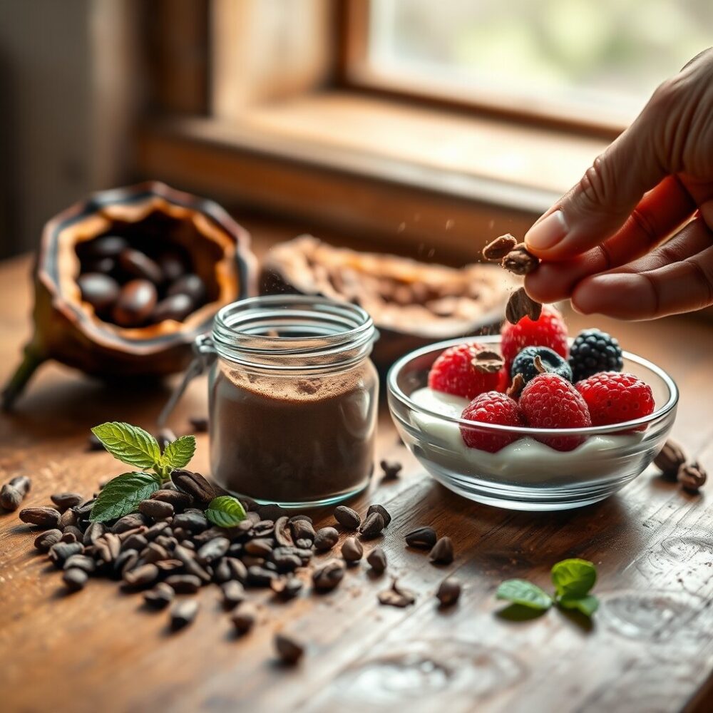 Espolvorea una cucharada de polvo de cacao crudo sobre yogur natural con frutas rojas; el contraste ácido de la fruta añade brillo, la textura polvorienta del cacao crea un crujido leve. Otra opción: mezclar cacao crudo con avena y semillas para un porridge de aroma intenso.