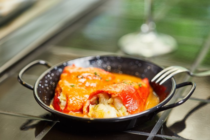 Cuando llegan los pinchos calientes vamos a encontrar nuevas propuestas como la Morcilla de Beasáin con base de escalibada. Un verdadero lujo ya que no hace falta que te levantes a la barra para mirar qué novedades han salido de cocina. La barra, además, comparte espacio en la planta baja con una zona de mesas altas en las que también se podrá disfrutar de una pequeña carta de tapas y raciones donde destacan los Bastones de berenjenas crujientes con humus y miel de caña; los Crujientes de queso con mermelada de tomate y tomillo; la Ensalada de bacalao ahumado con naranja, aguacate y piñones garrapiñados o el Bocadillo de rabas con alioli suave.