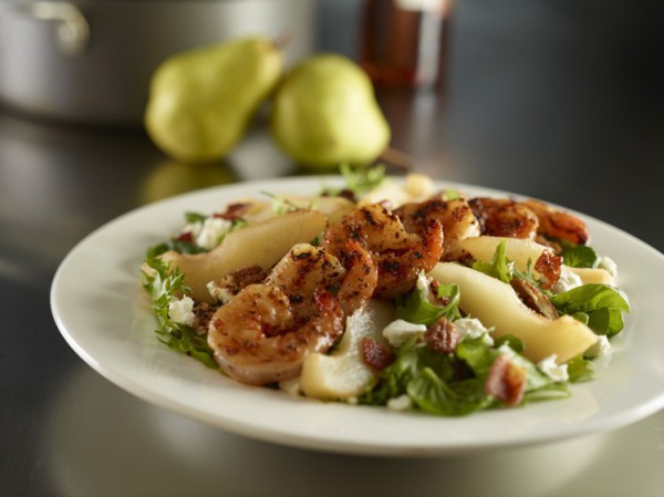Un plato perfecto con sabor a primavera en el que los tacos de queso de cabra se combinan con tiras de bacon, y una vinagreta dulce de mostaza Dijon. Adornada con trocitos de pera pochada, nueces picantes y gambas Cajun a la parrilla.