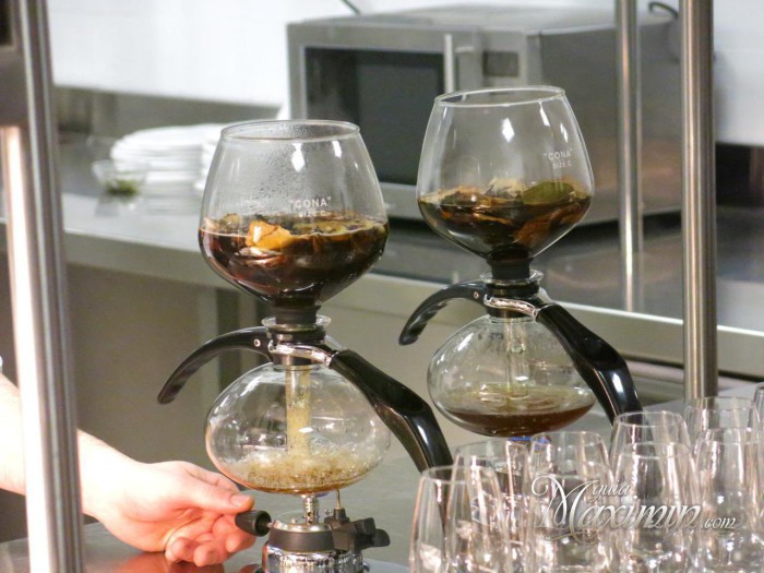 En un principio estuvimos en la cocina, donde estaban preparando y emplatando algunos de los platos fríos. El primero que probamos durante la presentación de los distintos rones efectuada por Mario Sandoval fué un bombón de foie con candi de ron Botran y crocanti de almendras (explosión del ron en boca con un sabor potente y delicioso. Un consomé, servido en copa, preparado con Ron Barceló y liebre, de un sabor sorprendente, pues el ron había sido reducido para rebajar su potencia. Con este aperitivo pasamos a ocupar las mesas para disfrutar el resto del menú que nos iba deparando sorpresa a sorpresa continuamente.