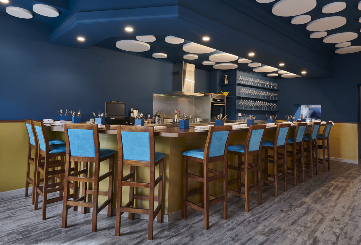 Precisamente esto es lo bonito de la experiencia: compartir con unos posibles desconocidos el amor por esta cocina ‘real’ y ‘de cerca’ y dejarse llevar por la maestría de Conus. Barra y sillas altas diseñadas a la medida en madera de castaño para la comodidad del cliente, y con el azul atlántico y el dorado como protagonistas de la decoración.