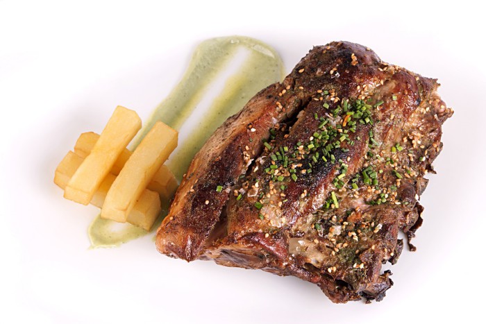 Costillas melosas de gochu a la brasa y su aliño de mostaza verde