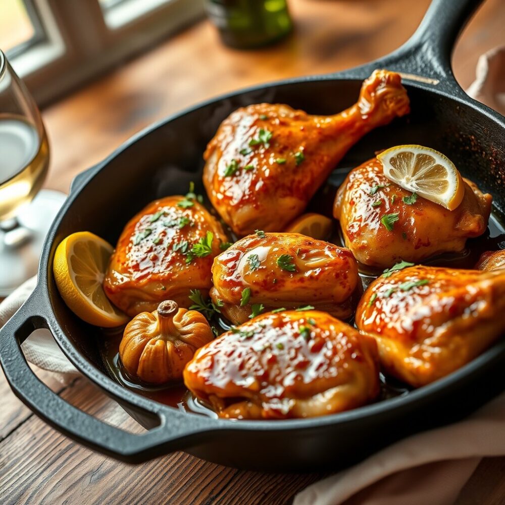 Para un toque más robusto, añade una cucharadita de pimentón dulce al dorar el pollo; tendrá color y un aroma ahumado. Si buscas un perfil más mediterráneo, incorpora aceitunas verdes y unas rodajas de limón en la cocción. Para una versión ligera, sustituye la mantequilla por más aceite de oliva y cocina a temperatura más baja, más tiempo.