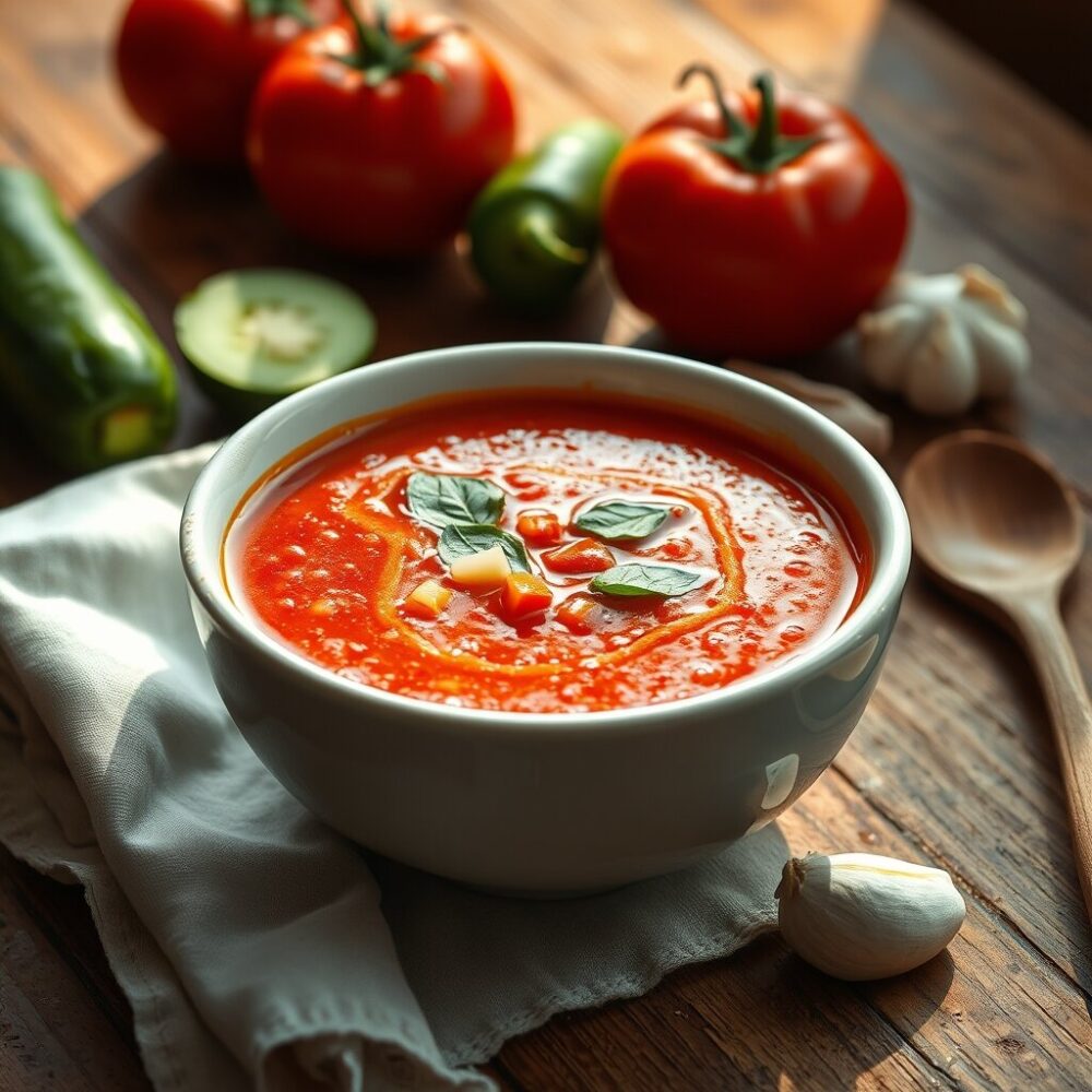 El gazpacho es una sopa fría originaria de Andalucía, pensada para los meses de verano. Tradicionalmente se consumía en el almuerzo o como primer plato en cenas ligeras. Su textura puede variar: desde completamente líquida hasta ligeramente espesa, según la cantidad de pan o aceite. Aquí proponemos una versión equilibrada, fresca y fácil, apta para comidas informales y picnics veraniegos.