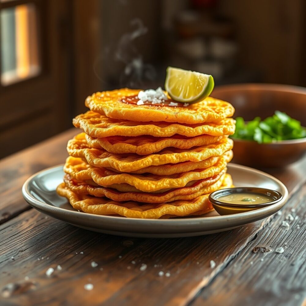 - Segunda fritura: sube el fuego a medio-alto. Fríe los discos 1–2 minutos por cada lado hasta que estén dorados y crujientes. La segunda fritura es la que crea la corteza crocante y la textura hueca característica.