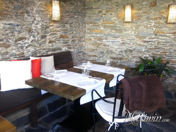 Hemos elegido la terraza, pero que no es a cielo abierto, sino que es como un soportal, por lo que no llega el sol de pleno ni el posible aire. Muy cómoda que dispone de estufas en la pared por si es necesario (principalmente por las noches), así como unas mantas para los más frioleros. Nos sirven unas almendras tostadas en la casa y un cóctel de Calvados, como bienvenida. Nos encantan los establecimientos donde se percibe que todo está hecho para satisfacer al cliente, el trabajo y dedicación para hacer un aperitivo de bienvenida.