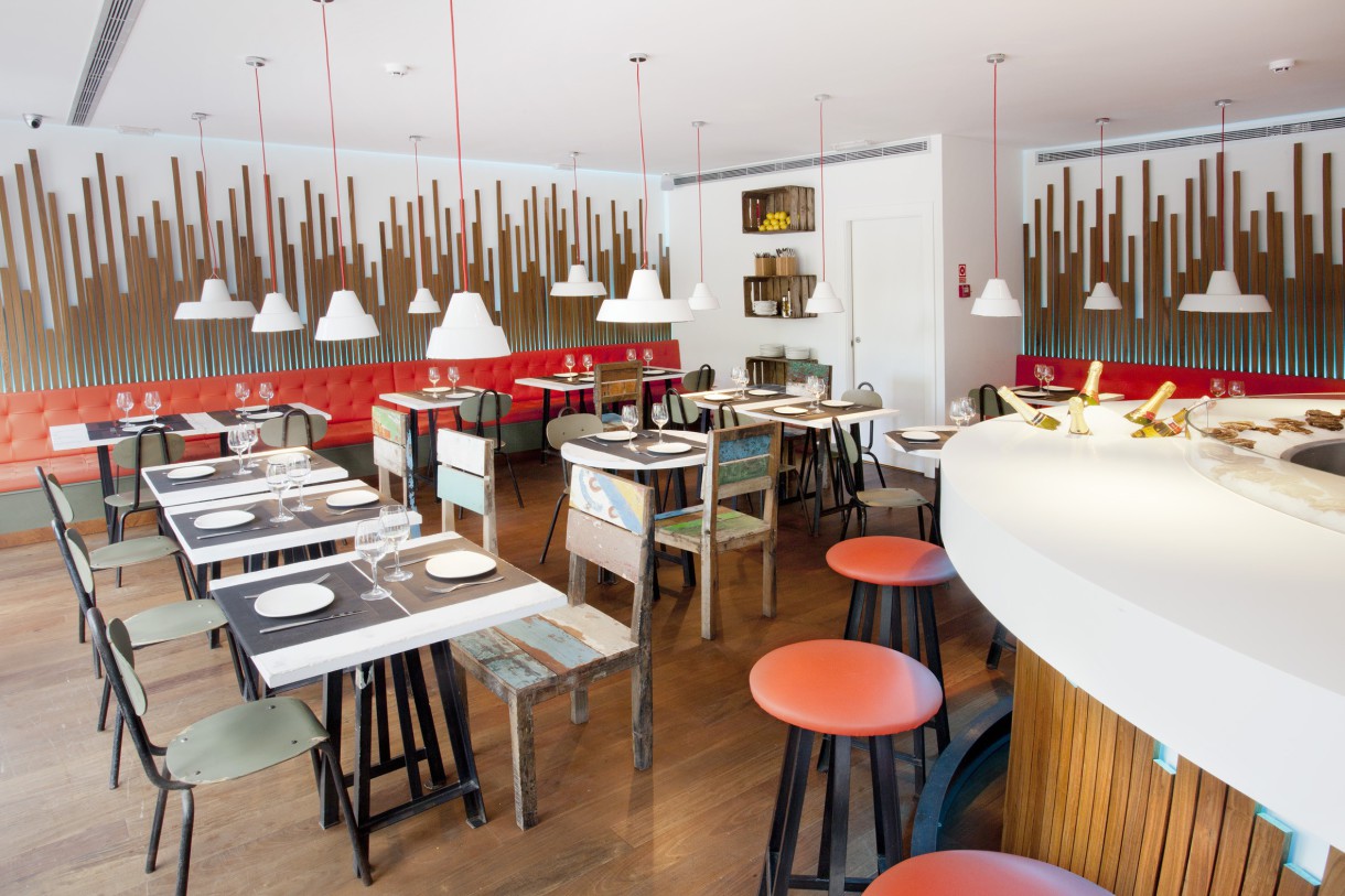 A la entrada se encuentra un ‘puesto’ con la mejor selección de mariscos: gambas, cigalas, centollos, nécoras, etc. Para encargar, llevar… ¡y degustar donde se prefiera! También cuenta con una redonda barra de ostras de Arcade, ideal para disfrutar de este pequeño afrodisíaco acompañado de champagne –y que además se transforma en zona de cócteles y combinados-; una amplia terraza y una dinámica barra con una oferta en la que destacan Langostinos a la milanesa o Croquetas de marisco.