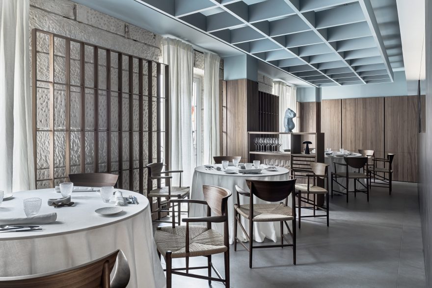 El enclave, enraizado con la historia de Burgos, y construido con piedra caliza proveniente de la misma cantera que la catedral de la ciudad, mantiene su estructura original de madera de finales del siglo XIX. El proyecto se ejecuta en torno a la calidez y pulcritud de la madera de nogal que asoma desde la entrada y conquista la planta principal hasta envolverla por completo hasta los 2,17m. Desde esa altura, el azul cielo – característico del Camino de Santiago-, está presente como forma de conectar el interior con el exterior inunda los techos dando paso a un marino rotundo en la recepción, como analogía del trabajo y la funcionalidad industrial de una fábrica.